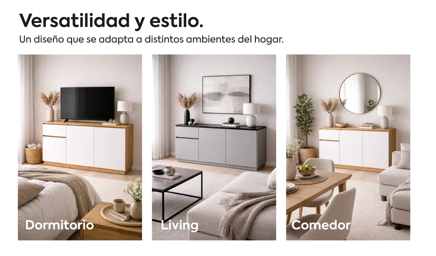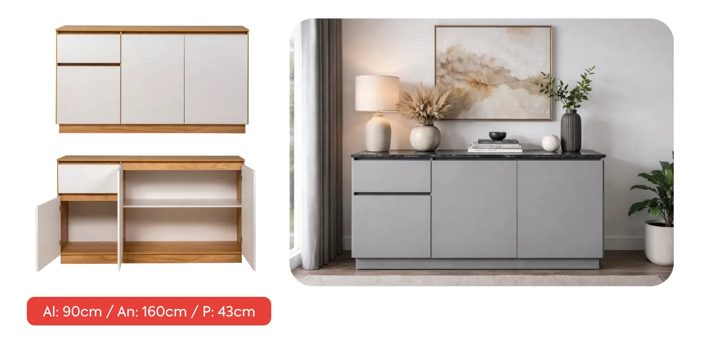 El nuevo Bahiut Mesina combina líneas limpias, gran capacidad de guardado y un diseño contemporáneo que se integra naturalmente a distintos espacios, living, comedor, estudio y dormitorio..